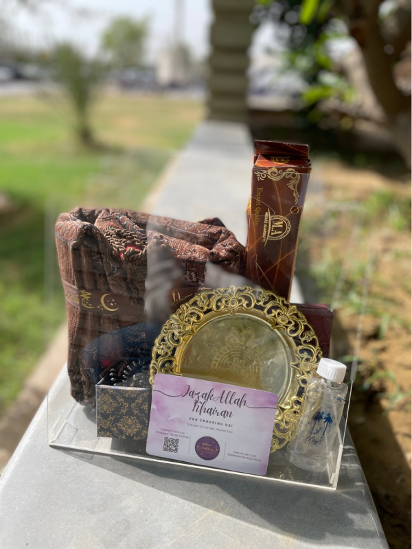 Our Gold Hajj Tabarruk Acrylic Bag by Gifts for Traditions is a beautifully curated Islamic gift set, ideal for pilgrims, family, and friends during Hajj.
