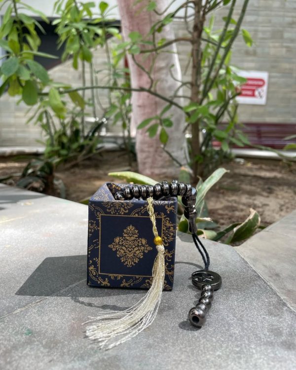 - A metallic Turkish tasbeeh– beautifully crafted to complement the prayer mat with matching square box.