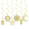 - Elegant gold Ramadan hanging decorations with crescent moons, stars, lanterns, and intricate Islamic patterns for festive home décor.